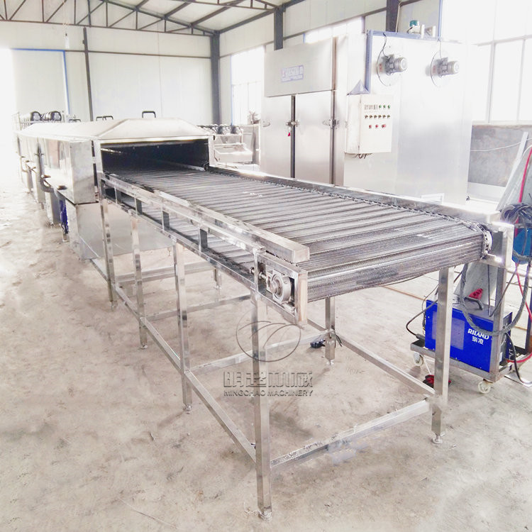 1、工藝流程:原料清洗去泥沙→噴淋清洗→風干機→烘烤設備→速凍