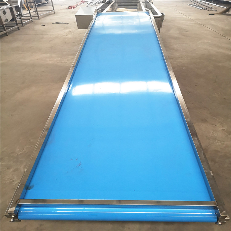 4、噴淋清洗機:通過紅薯清洗機遍沖洗,在通過網帶輸送到紅薯噴淋清洗機,通過多個噴嘴對紅薯表面褶皺殘留的細小泥沙清洗干凈,通過多道噴淋管道進行沖洗,底部設有多個水箱,水箱里面的水可循環利用,每個水箱都是獨立的,不會跟其他水箱里面的水連接,這樣就有效的保證了紅薯的完整度,表皮不受損失,前面紅薯清洗機跟噴淋清洗機為一條網帶,也是保證紅薯完整度的首要條件。