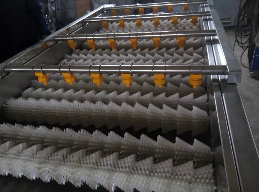 d:凈菜加工設(shè)備-毛刷清洗機(jī)是通過毛輥的轉(zhuǎn)動,把水果上面的泥土清洗干凈,不損害表皮,使水果表面光潔如新。例如:草莓、梨、桃、土豆、枸杞等球狀的水果。